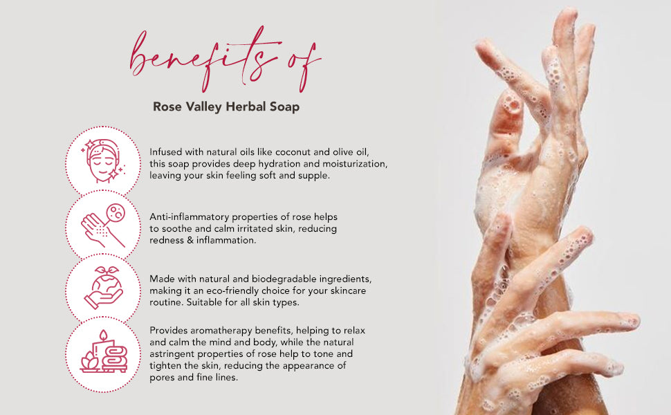 - Hydrating and Nourishing: Our Rose Valley Herbal Soaps moisturize and nourish your skin, leaving it feeling soft, supple, and deeply hydrated.